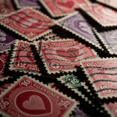 A dramatic, Dutch-angled close-up of a haphazard pile of colorful, aged Valentine's Day postage stam