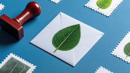 An envelope and stamps decorated with green leaves symbolize organic communication.