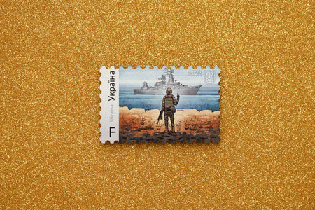 TERNOPIL, UKRAINE - SEPTEMBER 2, 2022 Famous Ukrainian postmark with russian warship and ukrainian soldier as wooden souvenir on golden glitter background surface