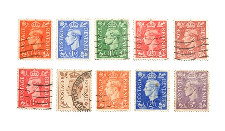 Vintage postage stamps on a white background, close-up.