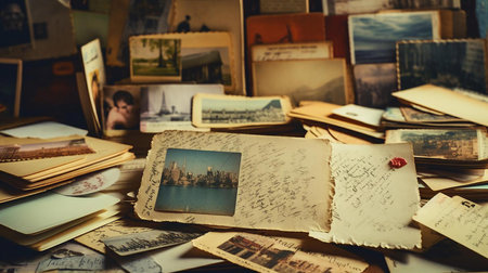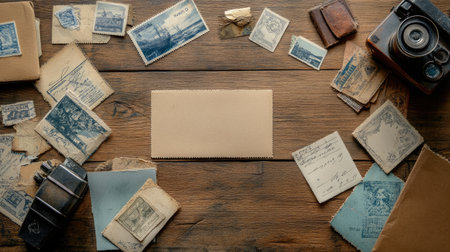 A visual collection of vintage postcards and photographs arranged on a wooden table. This scene conveys nostalgia and the art of correspondence through aged documents and a classic camera.