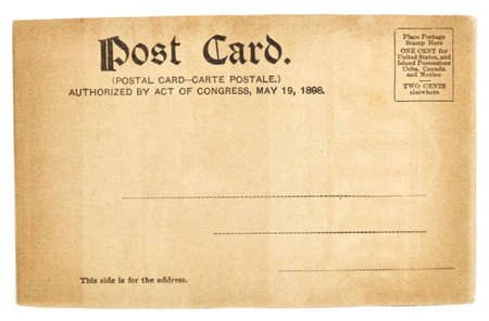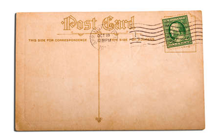 Old stained and faded postcard on a cork bulletin board with blank photo print