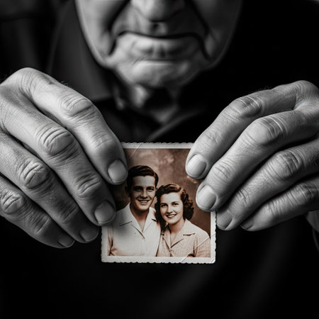 Close-up of a senior man's hands holding a family photograph, with a blurred background to symbolize fading memories.