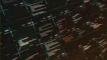 Abstract computer script source code with glitch effect. Animation. Screen of web developing hacker code on black background, seamless loop.