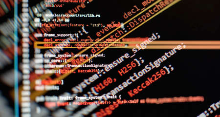 Abstract computer script code. Programming code screen of software developer. Software Programming Work Time.