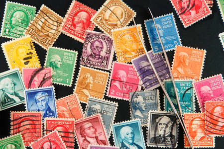 US postage stamps and tweezers on a black background