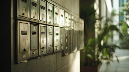 Neatly arranged mailboxes in the hallway of a condominium building. The mailboxes are silver, with clear apartment numbers, and a polished, modern aesthetic.