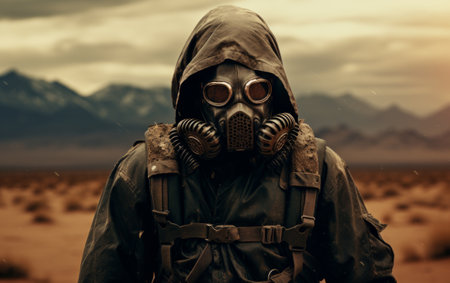 Man in gas mask in the desert. Conceptual image of danger.