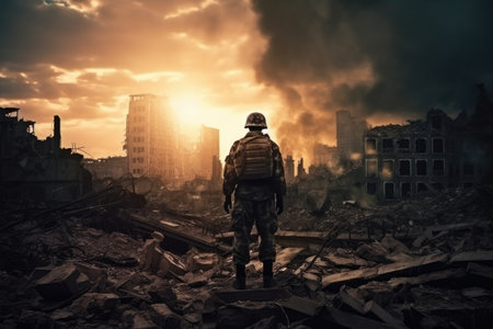 A lone soldier walks in a destroyed city. - image generated with Generative AI