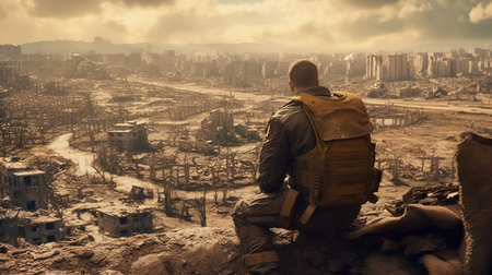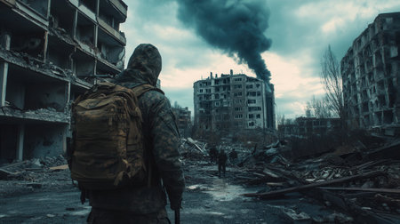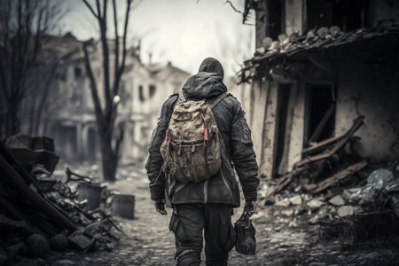 Man with a backpack on the background of the destroyed city. Mixed media, Lone soldier walking in destroyed city, AI Generated