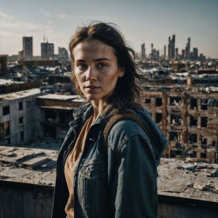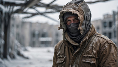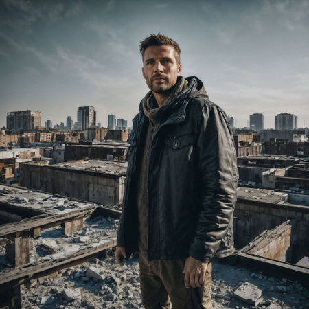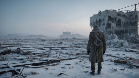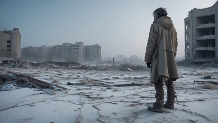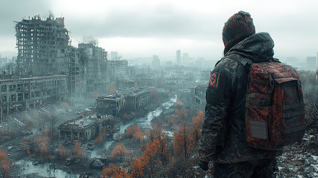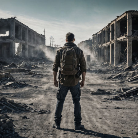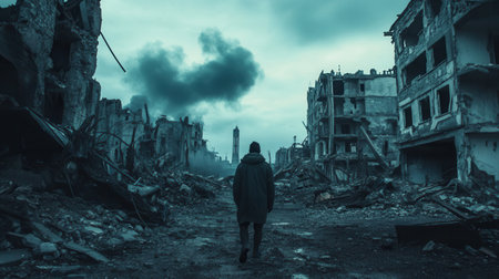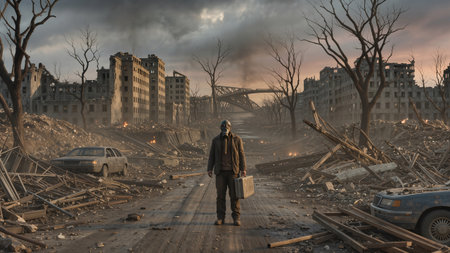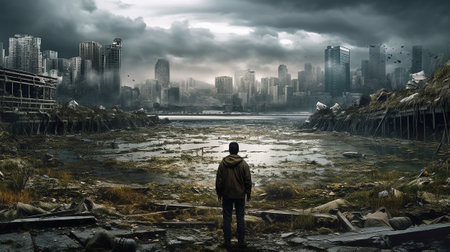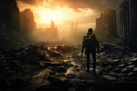 A lone individual stands in the remnants of an urban wasteland, the scene portraying a stark post-apocalyptic reality. The mood is somber and thought-provoking