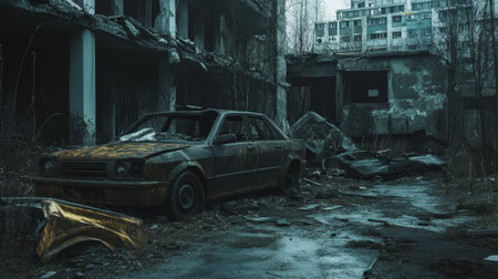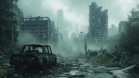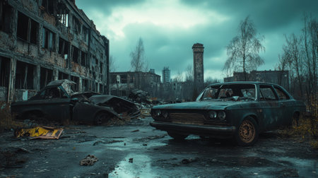 Desolate urban landscape featuring decayed buildings, rusted cars, and overgrown vegetation, evoking a post-apocalyptic or war-torn environment.