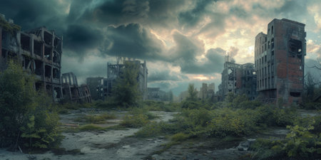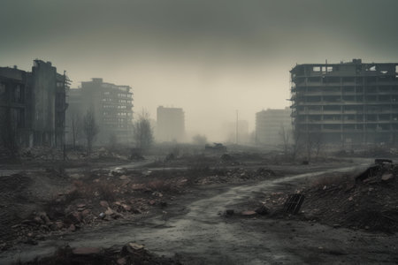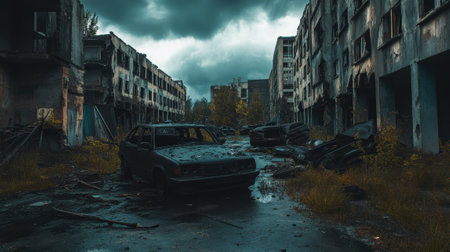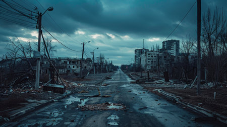 Desolation in a war torn ukrainian city ruined buildings, dark skies, and abandoned streets