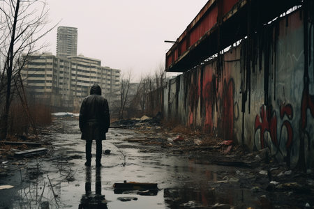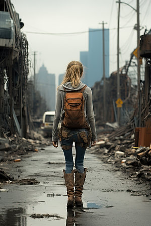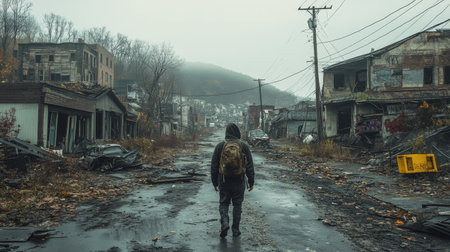 Solitary figure with a backpack standing amidst a desolate, abandoned urban landscape.