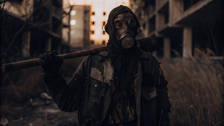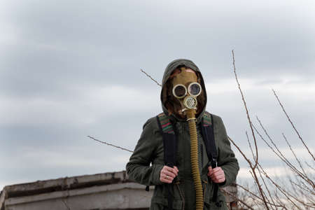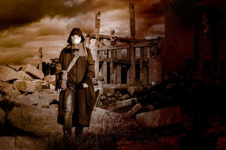 boy stands with a gun in his hand. boy in a gas mask. A young man in a protective cloak and hood. child standing near the destroyed building.