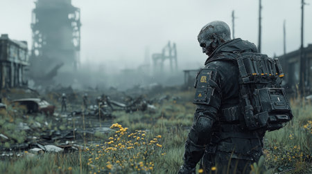 A lone soldier in a tattered uniform surveys a devastated city filled with remnants of destruction. Weeds and wildflowers grow among the debris, revealing nature's resilience.