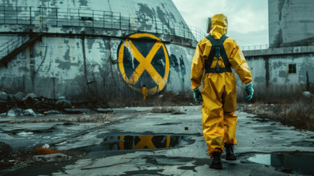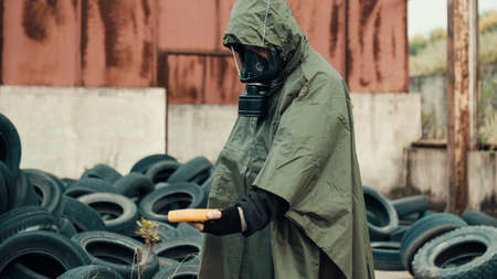 A man in a protective mask and protective clothing explores the danger zone. Ecological catastrophe. selective focus