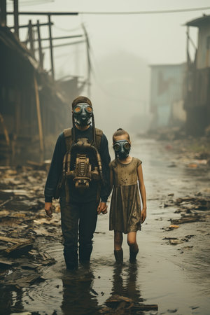 Two post apocalyptic survivors wearing dirty clothes and gas masks are standing together
