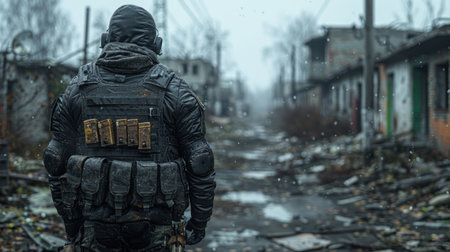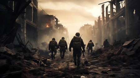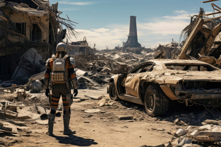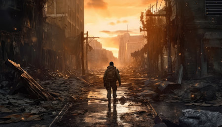 A lone soldier walks in a destroyed city. - image generated with Generative AI