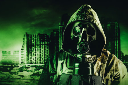 A man in a gas mask on a dramatic background of lifeless ruins. Selective focus.