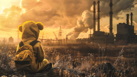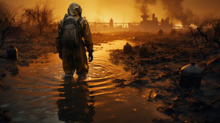 A man in a respirator stands against a smoking factory chimney. garbage around. ai