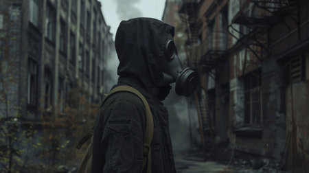 A mysterious person stands in the middle of the street back to the camera and face hidden behind a gas mask. The deserted .