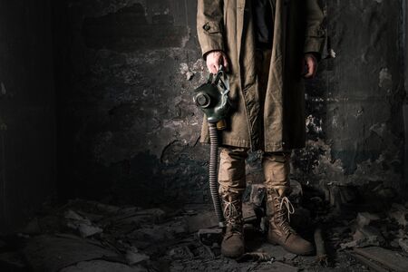 cropped view of man holding gas mask while standing near old wall in abandoned room, post apocalyptic concept