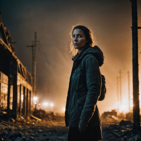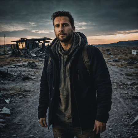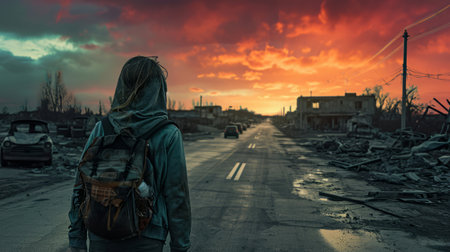 A lone wanderer stands in the foreboding glow of a dystopian dawn, overlooking a landscape scarred by disaster. The haunting beauty of the scene highlights the stark reality of a changed world