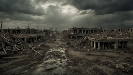 Desolate showing ruined concrete buildings with exposed rebar stand in rows under a dark, moody sky, depicting urban decay and destruction in a desolate landscape....