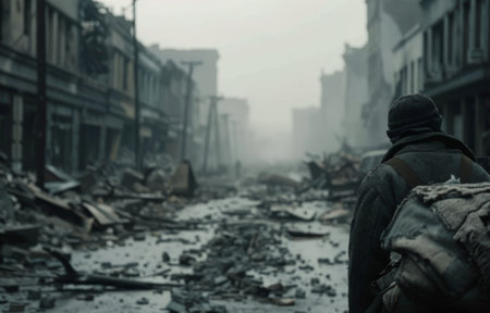 A solitary soldier stands amidst the ruins of a devastated city, surrounded by destruction and signs of a recent battle.