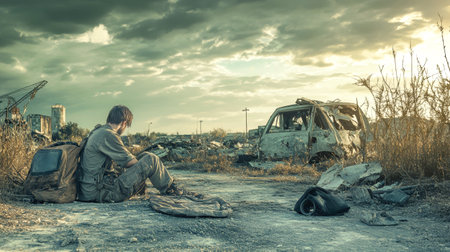 A solitary wanderer contemplates their existence amidst the ruins of a once-thriving city, surrounded by decaying vehicles and overgrown vegetation.