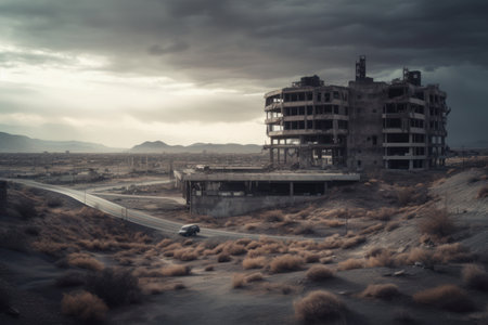 AI Generated. Desolate road through abandoned cityscape under dark clouds