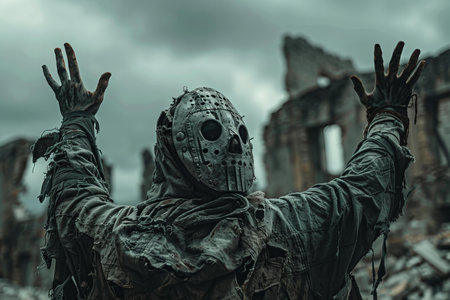 Horror photo of a scary stalker with skull face and gas filter mounted in it wearing jacket and armored vest on destructed apocalyptic city background.
