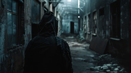 Fugitive, in ragged attire, seeking refuge in an abandoned factory among shadowy alleyways Photography, Silhouette lighting, Depth of Field Bokeh Effect, Mirror shot