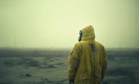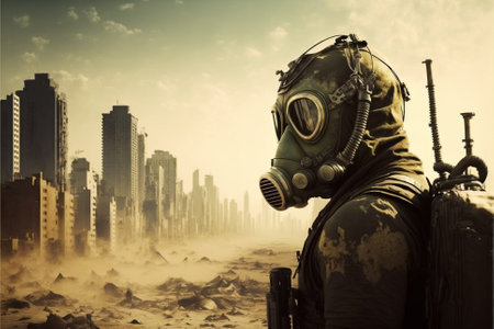 Photo of a stalker in jacket, armored vest standing back view in soviet gas mask with filter on destructed apocalyptic desert wasteland background.