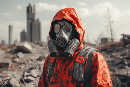Human in gas mask standing among ruins and dramatic sky background. Enviromental pollution, ecology disaster, radiation, biological hazard concept.