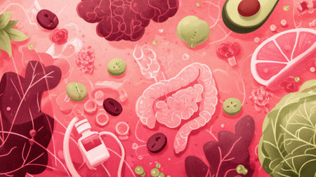 This artwork highlights various fruits, vegetables, and digestive features focused on gut health and overall wellbeing.