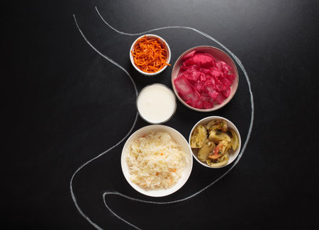 Probiotic foods for gut health inside stomach outline drawn on black chalk board top view