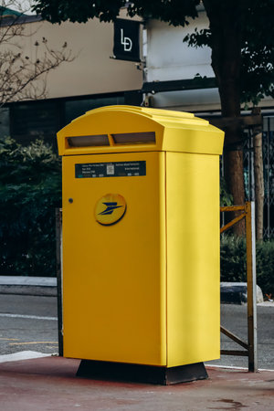 Paris, France - September 7, 2025: Traditional yellow La Poste mailbox on Rue de Rivoli in Paris, France