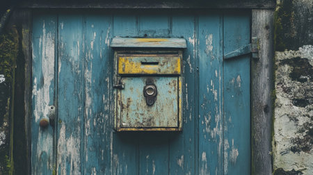 A captivating image featuring a rustic blue wooden door adorned with a vintage mailbox. This scene captures the charm of weathered exterior architecture, perfect for evoking nostalgia.