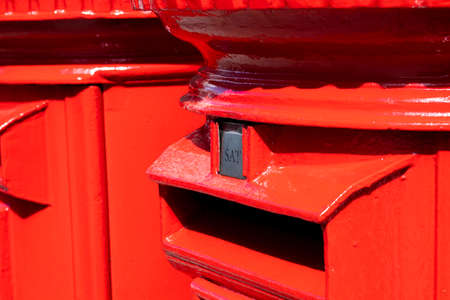 Red cast iron pillar boxes with SAT plate denoting the next collection day being Saturday