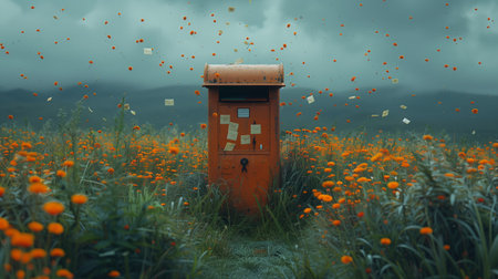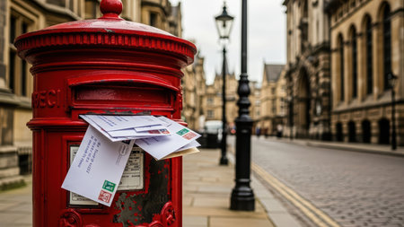 red mailbox with documents overflowing, mailbox hasn't been opened for a long time, red mailboxes on red walls