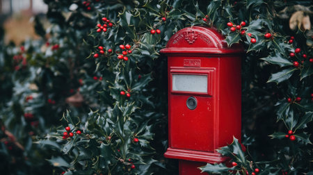 A charming vintage red mailbox stands proudly amidst lush holly and bright berries, embodying the festive spirit of Christmas and the joy of the holiday season.