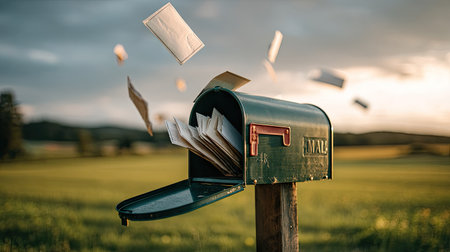 A green mailbox, open with multiple letters emerging from it. The composition features a natural outdoor scene with a blurred green field and sky. The image has a soft focus with warm lighting. It can be utilized for various commercial purposes, including marketing and communication materials.