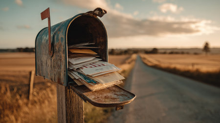 An open mailbox filled with letters sits roadside, the subject of this picturesque image. The composition showcases an open box with documents spilling out, set against a blurred background of a rural road and fields. The image features warm tones, soft lighting, and conveys a feeling of nostalgia. Suitable for editorial and commercial projects.