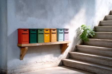 Row of colorful mailboxes on a wooden shelf next to stone stairs in sunlight