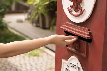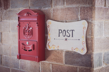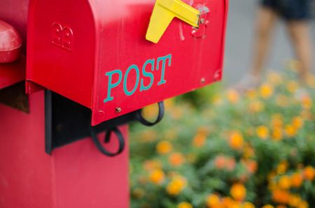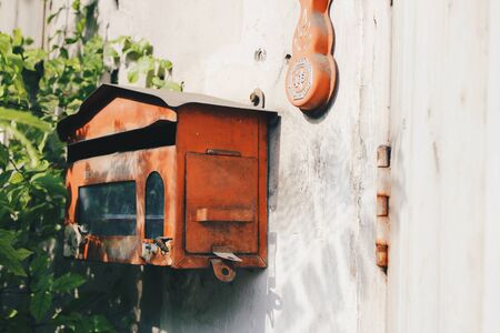 Red mailbox in front of the house with sunlight and beautiful natural background