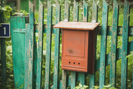 Red mailbox on a wooden fence in the garden. Selective focus.