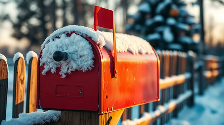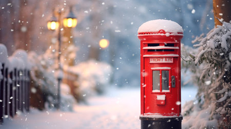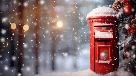 Festive red mailbox on a snowy Christmas tree with twinkling lights. A charming holiday scene featuring a vintage red mailbox nestled among evergreen branches glowing lights