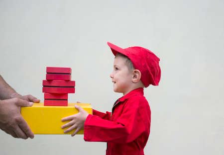 3-4 year old boy in a red jumpsuit and cap picks up some mailboxes from an unrecognizable adult. Parcel and letter delivery, postman's little helper, humorous quick delivery business ad